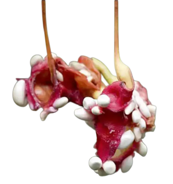 Fruto: Cápsula verde, de hasta 6″ de largo, que se abre para exponer semillas blancas incrustadas en pulpa escarlata.