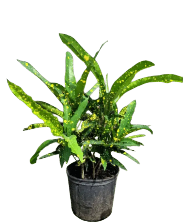 Descripción: Un cultivar de croton, conocido por su follaje llamativamente variado que parece haber sido pintado con audaces e irregulares salpicaduras de color.