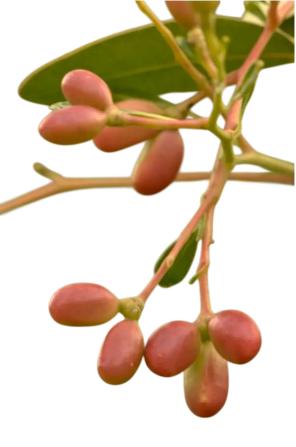 Fruto: Drupas de color rojo brillante que se vuelven negras cuando maduran.